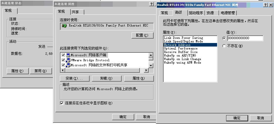 首先点击“属性”,然后点击“配置”,再接着把点击“高级”,选择network address,把修改后的MAC地址填入主机。建议直接选择不存在,以使用网卡出厂的物理MAC。